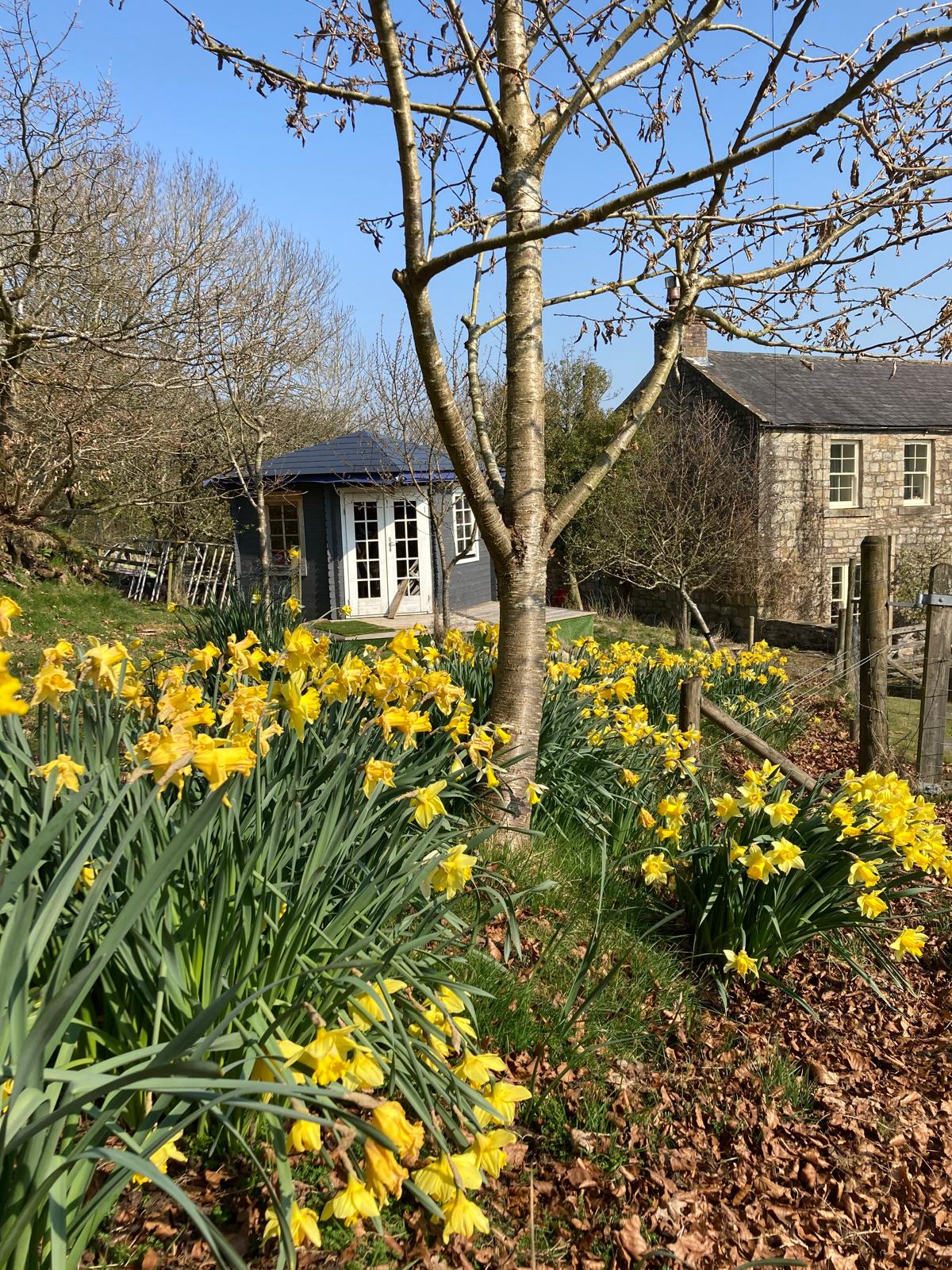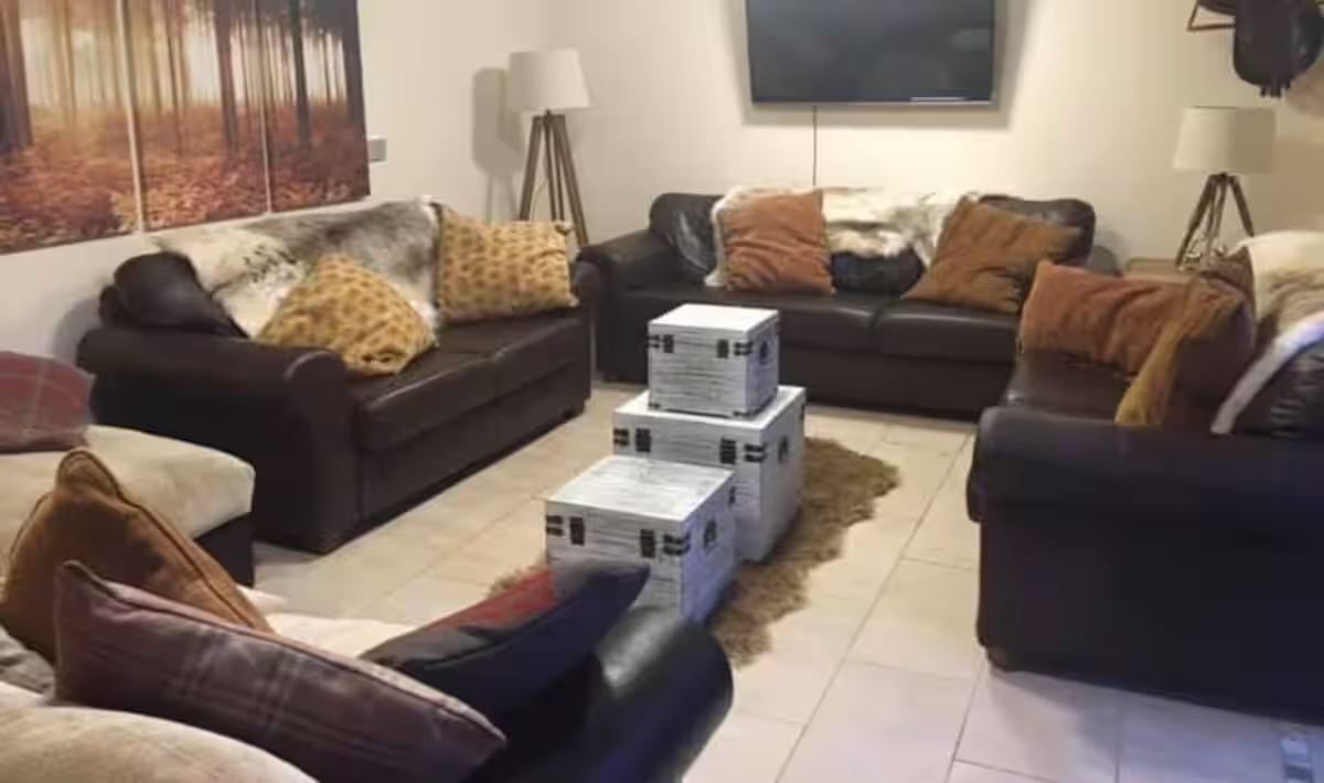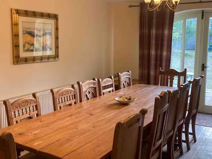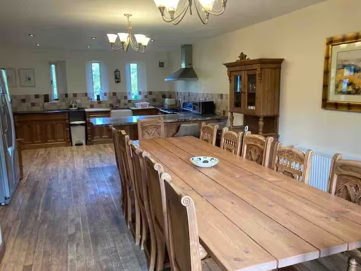 - Spacious open-plan lounge with French doors opening onto decked patio hot tub area with expansive views of pony paddock & valley , dining room / kitchen with Smart TV, Large dining table with chairs for twelve.