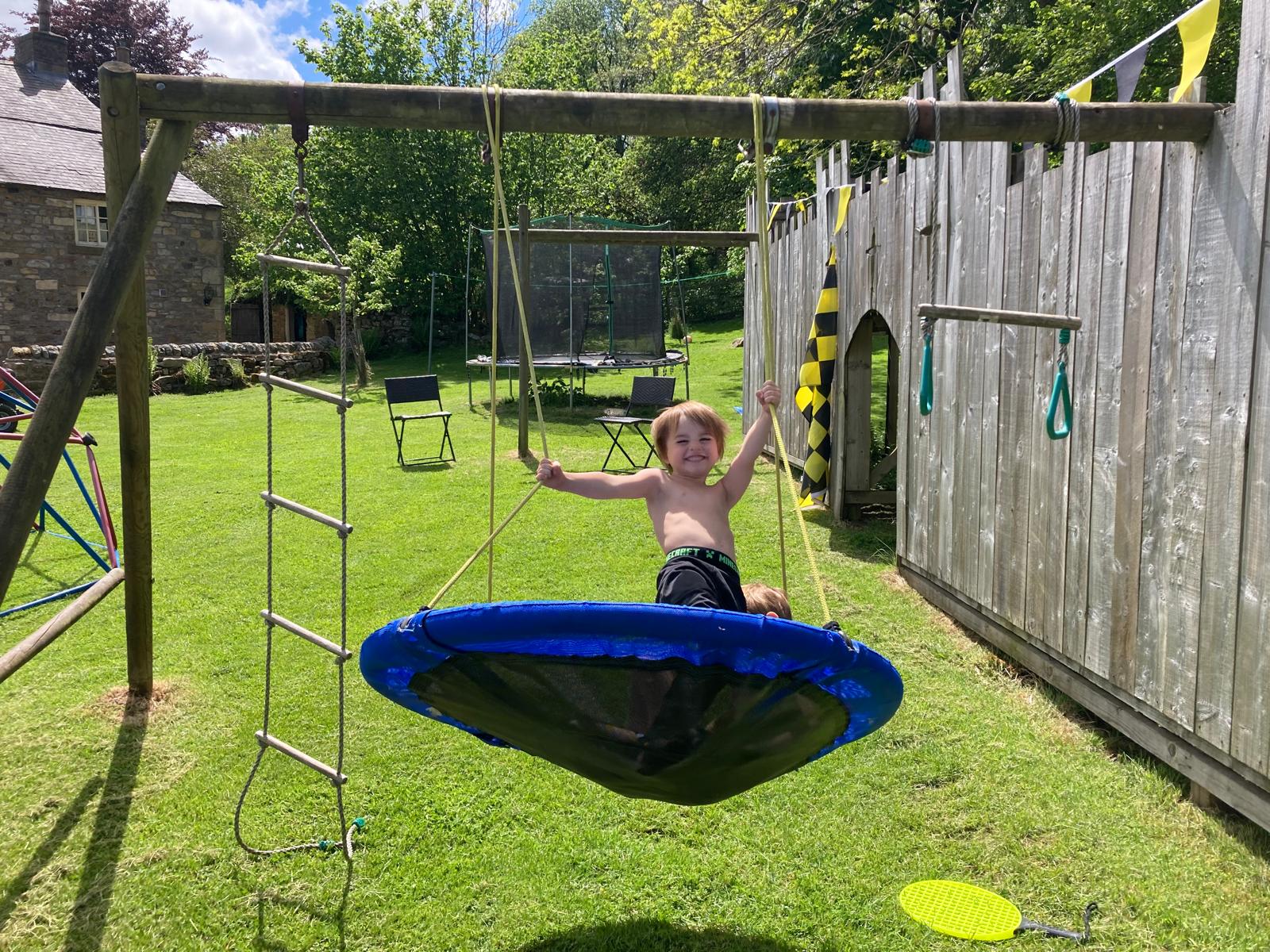 Large children’s play area with wooden fort slides nest swing & climbing frame